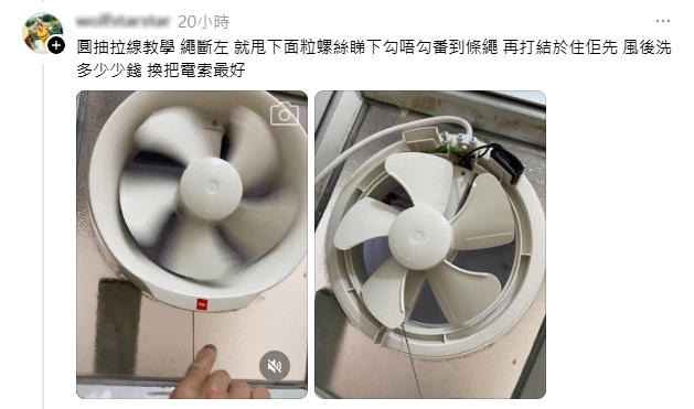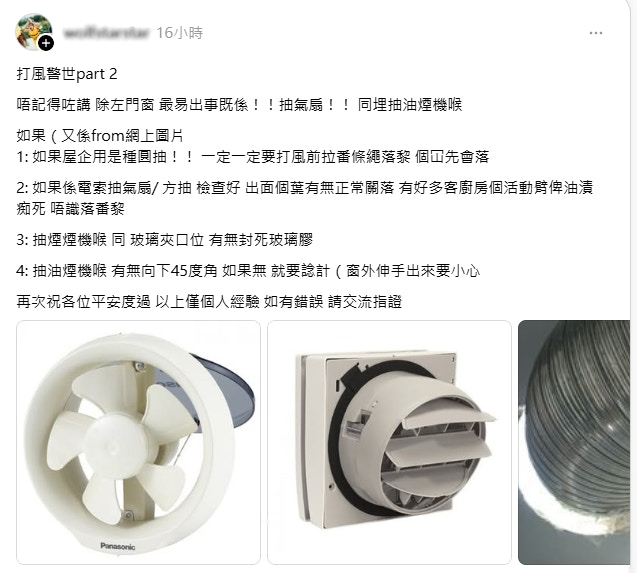 除了門窗之外,樓主另外還發布新貼文提醒,抽氣扇和抽油煙機喉也是打風時的高危位置。如果家中使用圓形抽氣扇,一定要在打風前將抽氣扇的拉繩拉下來,讓外面的蓋子蓋住抽氣扇;如果使用電索抽氣扇或方形抽氣扇,則應該仔細檢查抽氣扇後的扇葉能否正常關上,因其活動臂可能會被油漬黏住而無法關好。